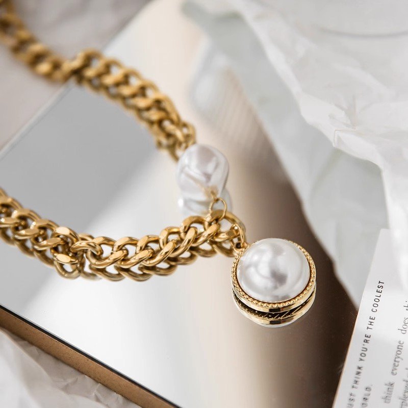 Exaggerated golden thick-chain large pearl necklace women’s sweater chain summer hoodie trendy European style online celebrity fashion – does not fade