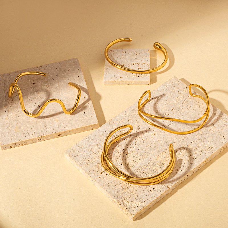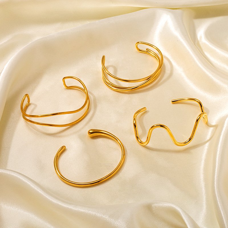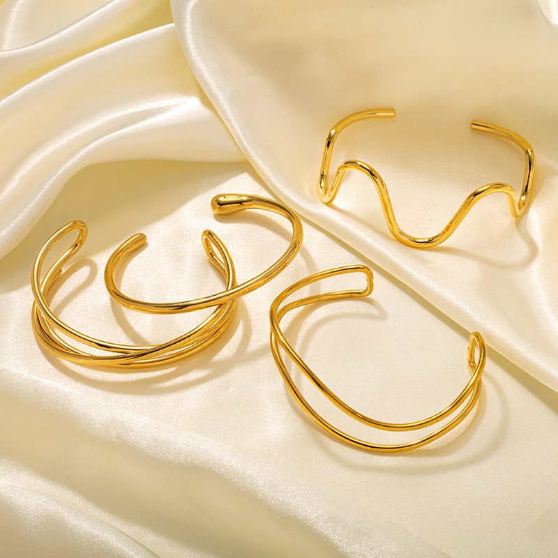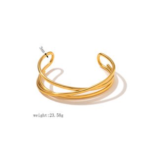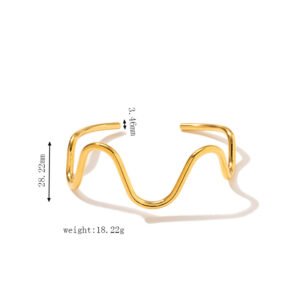 18K Gold Plated Stainless Steel & Titanium Steel Bracelet – Open Cuff Bangle with Three and Two Wavy Lines Crossed and Twisted